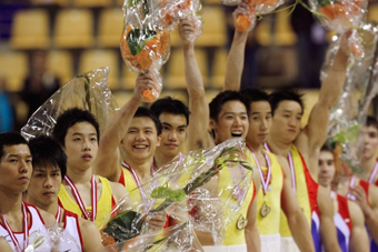 Gymnasts from China celebrate their gold medals win on the podium following the men's team final at the 39th Artistic Gymnastics World Championships in Aarhus, Denmark, October 17, 2006. Team China won the gold medal on Tuesday followed by Russian silver and Japan's bronze. [Reuters]