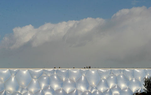 | Workers work atop of the National Aquatic Center, nicknamed the "Water