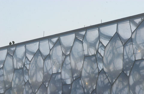Workers work atop of the National Aquatic Center, nicknamed the "Water Cube", in Beijing November 4, 2006. The installation of inflatable films of the center has been completed. [newsphoto]