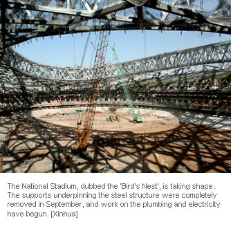 The National Stadium, dubbed the 'Bird's Nest', is taking shape. The supports underpinning the steel structure were completely removed in September, and work on the plumbing and electricity have begun. Construction is expected to finish by the end of 2007. Photo: taken on November 5,2006. [Xinhua]