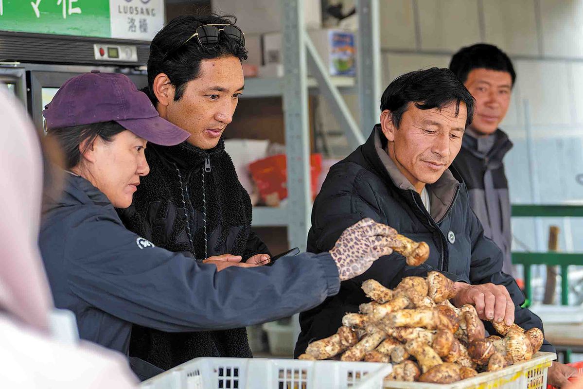 Chunpi (second from left) and staff sort through matsutake from Jidi village at a stall in the Shangri-La matsutake market, on July 24. GAO YONGWEI/XINHUA