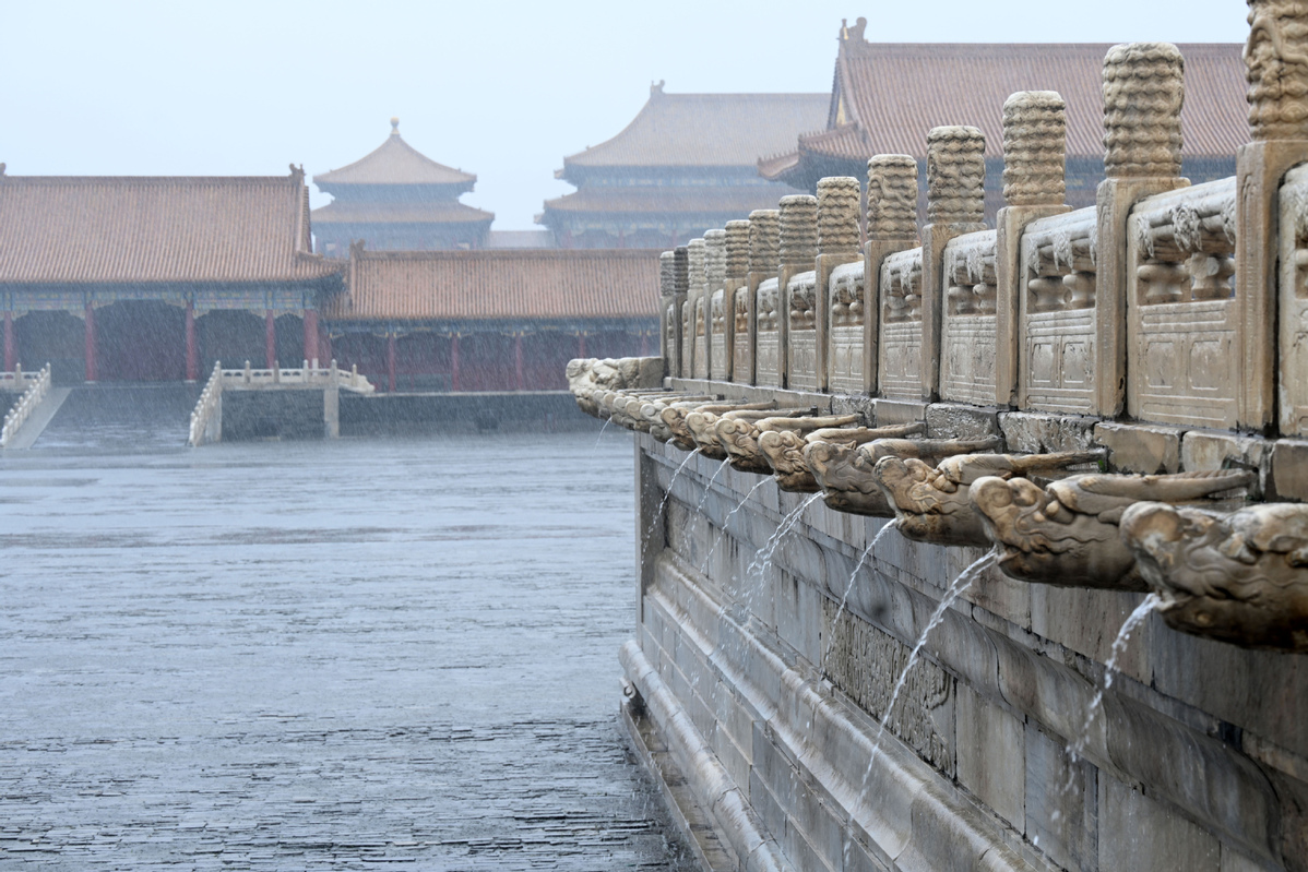 chishou (mythical animal-headed gargoyle) on the terrace of the Hall of Supreme Harmony drains rainwater during a rainfall at the Palace Museum on July 31, 2023. [Photo/Xinhua]
