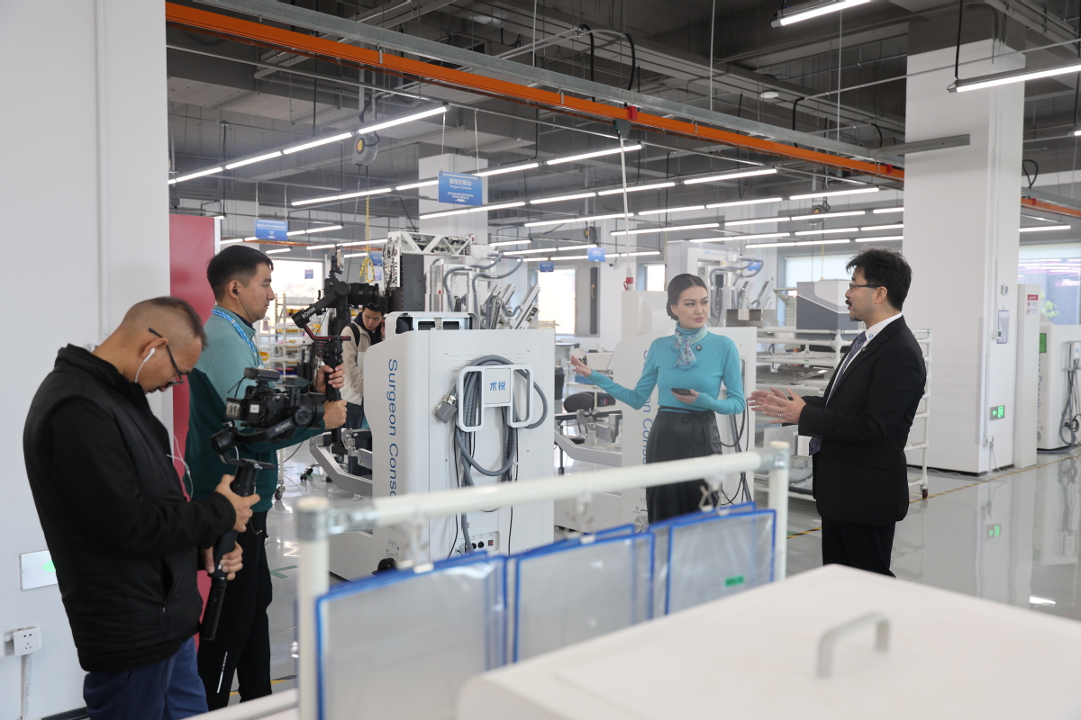 On the morning of Oct 21, Russian and Kazakhstan film crews visited the innovation center and manufacturing base of Surgerii Robotics in Daxing district, Beijing. They explored its technological breakthroughs and clinical application achievements in the field of single-port laparoscopic surgical robots. Laparoscopy involves a minimally invasive procedure to look inside a patient's stomach or pelvis.