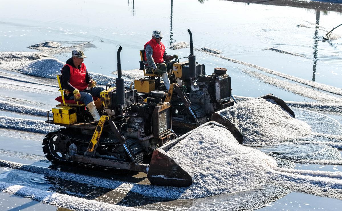 Workers at the Zhangmeng salt field take advantage of the sunny weather to harvest sea salt in Renhe town, Rongcheng, Shandong province. [Photo by Li Xinjun/for chinadaily.com.cn]