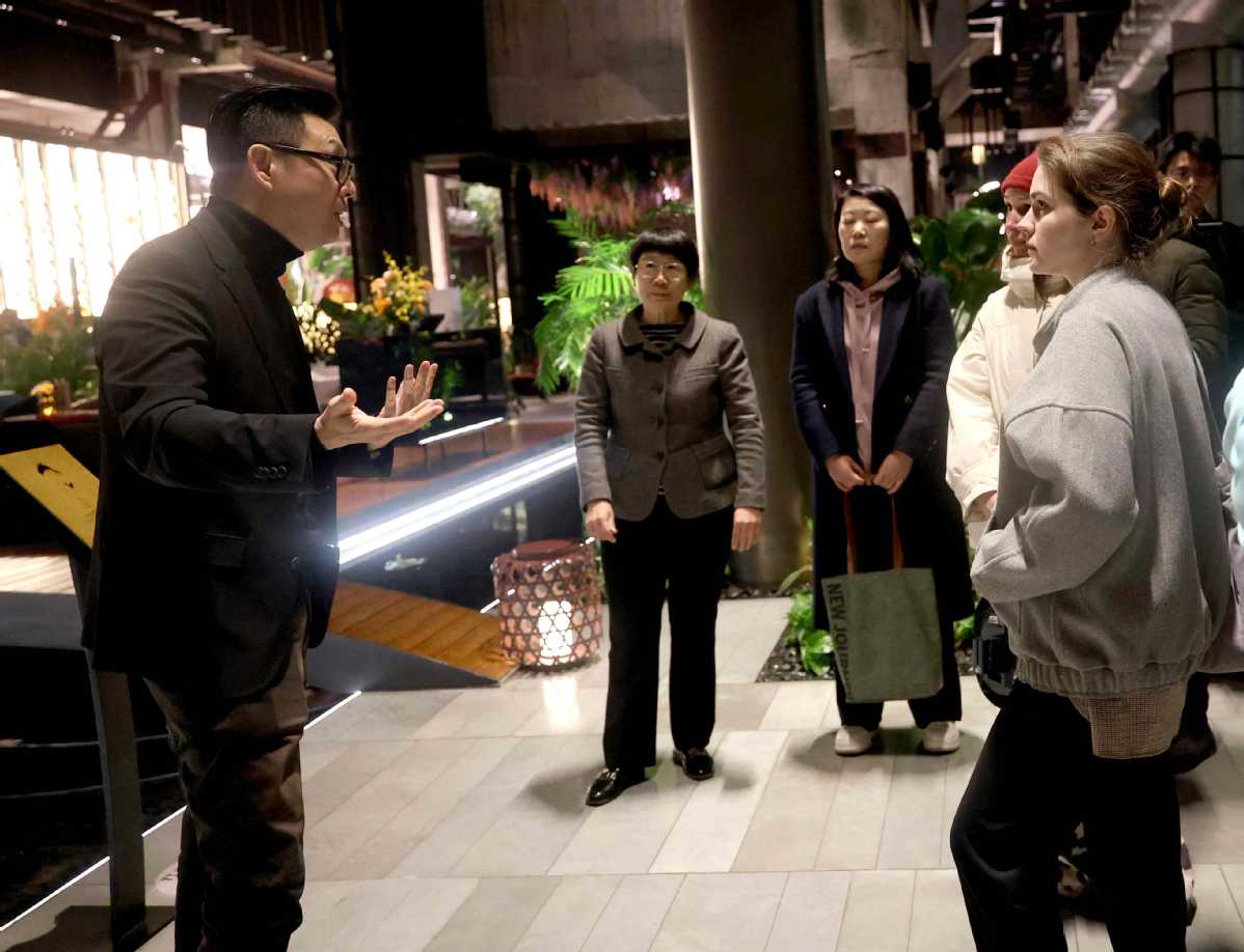 The General Manager of Shangri-La Shougang Park, Cai Jiancheng, is introducing the hotel to the filming crew.