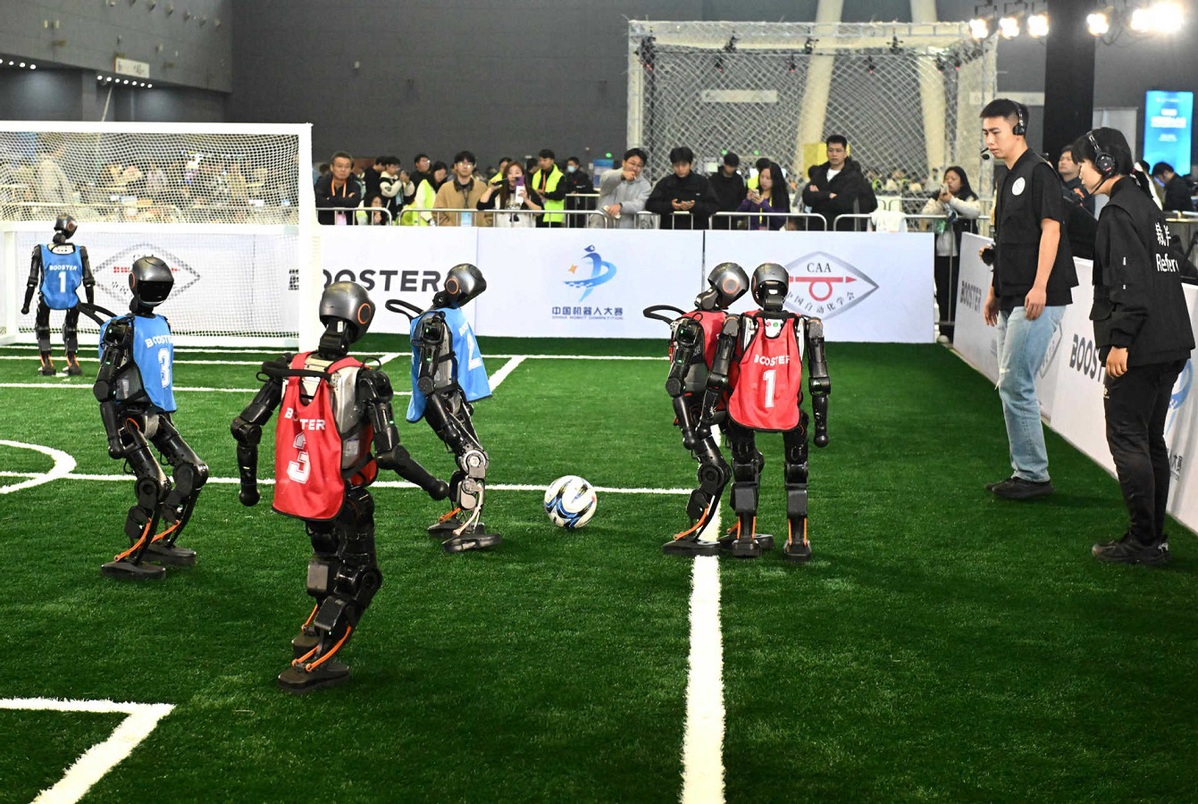 Robots are pictured during a football game at the International Convention and Exhibition Center in Shijiazhuang, North China's Hebei province, Oct 17, 2025. [Photo/Xinhua]