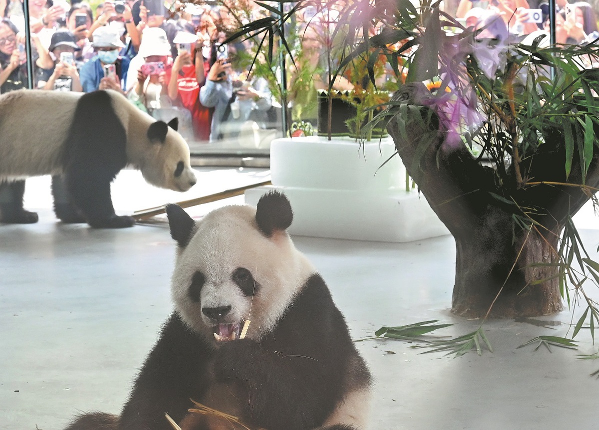 Jiu Jiu (front) and You You, the newly arrived male twin pandas at Guangzhou Zoo, Guangdong province, draw a large crowd on Oct 20, 2025, as the zoo's upgraded giant panda pavilion opens. CHEN CHUHONG/CHINA NEWS SERVICE