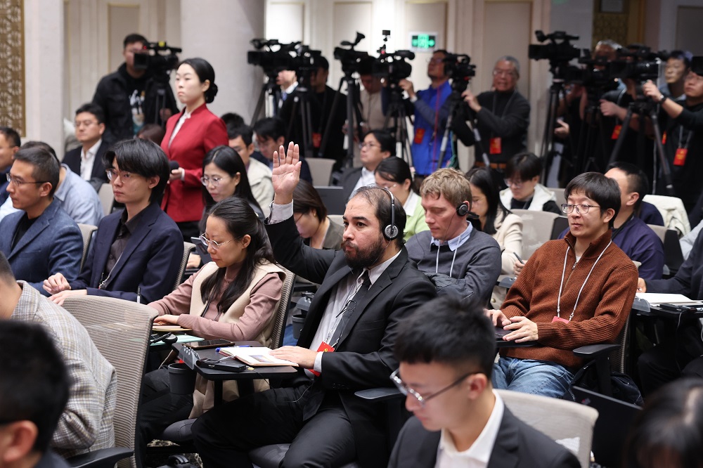 A journalist raises his hand to ask questions during a news conference held by the CPC Central Committee on the guiding principles from the fourth plenary session of the 20th CPC Central Committee on Oct 24, 2025. [Photo by Wang Zhuangfei/chinadaily.com.cn]