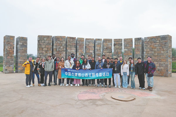 Tour members assemble for a group photo with the banner "Discovering Shanxi's Ancient Chinese Architecture — Overseas Media and Students Tour" at the Taosi Relics Site in Xiangfen. [Photo/WEI BO/YAN CHANGJIANG/FOR CHINA DAILY]