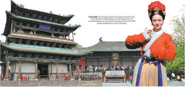 From left: The Yingxun Gate of Pingyao Ancient City. Wuji Hall of Yongle Palace in Yuncheng city. An actress dressed as a painted maiden statue at the Hall of Sacred Mother in Jinci Taiyuan. [Photo/WEI BO/YAN CHANGJIANG/FOR CHINA DAILY]