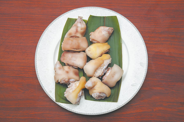 Fotiaoqiang's ingredients include (from top) abalone, fish lip, pork, scallop, duck (left) and duck gizzard (right). [Photo provided to China Daily]