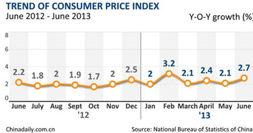 China's consumer price index, a main gauge of inflation, grew 2.7 percent year on year in June, up from 2.1 percent in May.
