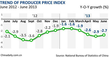 China's producer price index, which measures inflation at the wholesale level, fell 2.7 percent year on year in June.