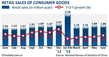 China's retail sales grew 12.7 percent year on year in the first half of 2013, the National Bureau of Statistics announced Monday.