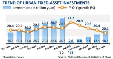 China's urban fixed-asset investment grew 20.1 percent year on year to 18.13 trillion yuan in the first half of 2013.