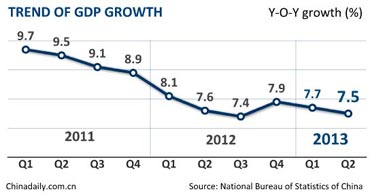 The growth of China's gross domestic product slowed to 7.5 percent year-on-year in the second quarter, down from 7.7 percent in the previous quarter.