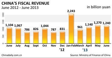 China's fiscal revenue grew 7.5 percent year on year to 6.86 trillion yuan ($1.12 trillion) in the first six months of the year.