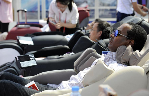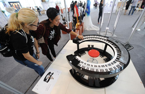 A visitor looks at a work at the Seventh Cultural and Creative Industry Fair in Nanjing, capital of East China's Jiangsu province, Oct 17, 2014. The three-day fair opened on Oct 17 at the Nanjing International Exhibition Center. [Photo/Xinhua] |