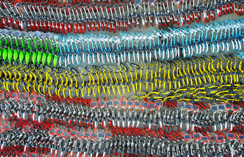Bicycles of ofo (in yellow), Mobike (in orange), Xiaoming (in blue) and 100bike (in green) parked in Shanghai, on Mar 1, 2017. [Photo/VCG] |