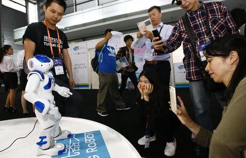 A visitor takes a close look at the smartwatch unveiled by Lenovo Group Ltd in Beijing, May 28, 2015. Executives from technology giants such as Microsoft Corp and Baidu Inc attended the global technology event. [Photo/China Daily] |