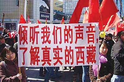 Overseas Chinese students in Canada hold banners protesting the western media bias against China in reports on the recent Tibet riots. The banner reads, "Listen to our voices, know the real Tibet". The founder of anti-CNN.com is planning to sue the American television network for distorting the facts about Tibet in its broadcasts. [Beijing Morning Post]