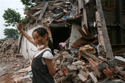 Nine-year-old Xia Xueyin, her face badly bruised from a fall during last week's earthquake, poses for a photo by her father in front of her family's damaged home in Hanwang town of Sichuan province, Thursday, May 22, 2008. The girl's parents said that they brought her back to her home to see the damage and look for her belongings to help her cope with the trauma of having experienced the May 12 earthquake. Experts say post-traumatic stress caused by a disaster of the scale China just experienced can ripple through a stricken community long after the rubble has been cleared, and can have seriously debilitating effects. [Agencies]