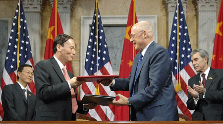 China's Vice Premier Wang Qishan (2nd L) and US Treasury Secretary Henry Paulson (2nd L) exchange documents after signing an agreement at the end of the Strategic Economic Dialogue at the Treasury Department in Washington June 18, 2008.
