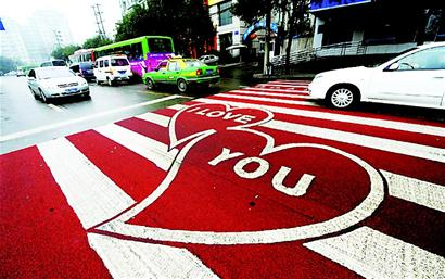 雖然被冠名為“愛情斑馬線”,但在外觀上和使用功能上,這條斑馬線并無特殊之處。交警三分局民警說,去年的七夕、國慶幾個大的節(jié)假日,人行道加上立錐筒,合江亭更添喜慶氣氛。“我們就考慮借用成都公交車專用道的紅色路面,讓這條斑馬線有一些改變?!蹦甑祝麄冊诰W(wǎng)上查閱了一些國內(nèi)外有特色的斑馬線作為借鑒,這才定下最終設(shè)計。