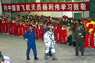 At the solemn sending-off ceremony, Yang took an oath: "I will not fail the expectations of all Chinese people and the motherland." Yang Liwei was selected from a group of three finalists. In the past few days, they engaged in relevant operations and tests within the Shenzhou 5 spaceship, mainly ways to escape and survive when unexpected hazards happen. *** Top rocket sends manned craft aloft China used its top rocket, the Long March CZ-2 F, to launch its first manned space flight, an official with China's space programme said yesterday. Huang Chunping, commander-in-chief of rocket systems, said the CZ-2 F was developed based on the Long March CZ-2 E to accommodate the technical requirements of human space flight. With the application of 55 breakthrough technologies, including fault-detection and escape systems, the spacecraft and rocket both have reached advanced international levels, Huang said. The rocket measures 58.3 metres, with a takeoff payload weight of 479.8 tons. It is the longest and heaviest rocket China has ever developed, Huang said. It has so far sent four unmanned Shenzhou spaceships into pre-set orbits in space. "The rocket that will launch the Shenzhou-5 spaceship is the best of all,'' he said. "It is of superior quality and has stood our most stringent testing,'' Huang noted.