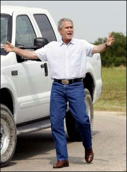 布什穿著牛仔褲和牛仔靴迎接北約秘書長(zhǎng)。