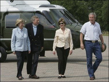 據(jù)美國媒體報(bào)道,在21日的會(huì)談到來之前,布什總統(tǒng)先帶著夏侯雅伯參觀了他的私人農(nóng)場(chǎng)。在德克薩斯?fàn)N爛的陽光中,穿著牛仔褲和牛仔靴的布什在第一夫人勞拉的陪伴下迎來了夏侯雅伯夫婦。布什對(duì)夏侯雅伯說:“這里就像是一個(gè)小天堂。”