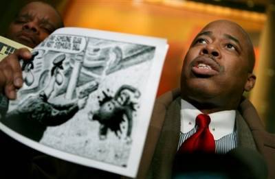 紐約州參議員亞當斯手持引發(fā)爭議的漫畫站在紐約郵報大樓前抗議