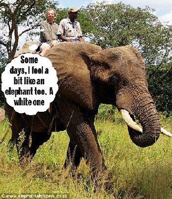 布萊爾騎大象。圖片文字為“有時(shí),我也覺(jué)得自己像頭大象,是只大白象?!?/p>