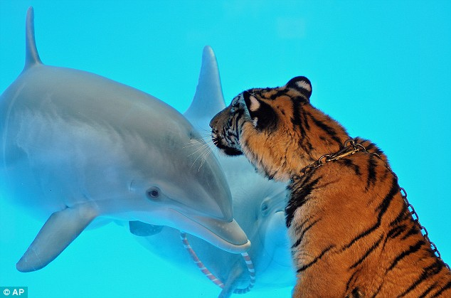 據(jù)英國(guó)《每日郵報(bào)》3月7日?qǐng)?bào)道,6個(gè)月大的老虎寶寶阿卡莎和14個(gè)月大的海豚馬夫里克都住在美國(guó)加州的一個(gè)主題公園中,阿卡莎每天都要在飼養(yǎng)員的陪伴下出來(lái)散會(huì)兒步。這一天,阿卡莎來(lái)到了水族館中。