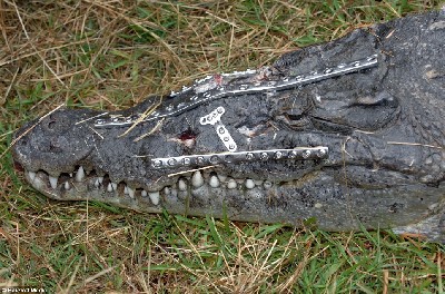 中國(guó)日?qǐng)?bào)網(wǎng)環(huán)球在線消息:上夾板、釘鋼釘,這可是骨科醫(yī)生醫(yī)治嚴(yán)重骨折病人常用的醫(yī)療手段。而在美國(guó)佛羅里達(dá)州的一個(gè)動(dòng)物園里,一只可憐的大鱷魚也被獸醫(yī)在頭部固定了4塊鐵板,釘了41枚釘子。一年前這條鱷魚的頭部曾被一輛汽車直接碾過,害它差點(diǎn)喪了性命?,F(xiàn)在在獸醫(yī)的幫助下,這條鱷魚又可以繼續(xù)正常地生活了。當(dāng)然,在其它鱷魚看來,戴上鋼鐵面具的它可能顯得有點(diǎn)“丑丑的、怪怪的”。