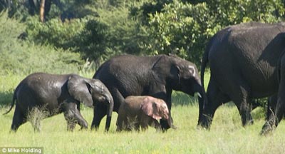 據(jù)專家介紹,這頭小象患有白化病。不像許多患白化病的動(dòng)物的皮膚或皮毛是白色的,患白化病的象的皮膚更多是紅褐色或者粉色的。白化病在亞洲象中相當(dāng)常見(jiàn),但是在較大的非洲象中非常罕見(jiàn),因此拍到這頭小象的影像顯得格外珍貴。生態(tài)學(xué)家邁克·蔡斯博士說(shuō):“我只聽(tīng)說(shuō)在南非克魯格國(guó)家公園有過(guò)3頭患白化病的象。我們?cè)谶@一地區(qū)已經(jīng)研究大象近10年了,這還是我第一次看到紀(jì)錄一頭白化病小象的證據(jù)?!?/p>