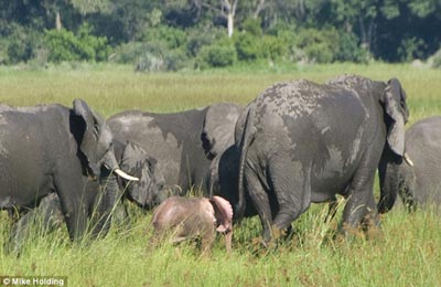 中國(guó)日?qǐng)?bào)網(wǎng)環(huán)球在線消息:英國(guó)攝影師邁克·霍爾丁日前在非洲博茨瓦納的奧卡萬(wàn)戈三角洲拍攝象群時(shí)意外發(fā)現(xiàn)一頭粉色小象!專家稱小象患有白化病,而這種現(xiàn)象在非洲象中非常罕見(jiàn)。