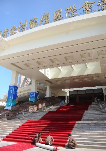 4月8日,工作人員在博鰲亞洲論壇主會(huì)場(chǎng)入口鋪設(shè)紅地毯。 2008年博鰲亞洲論壇年會(huì)將于4月12日召開(kāi),目前論壇會(huì)議準(zhǔn)備工作已經(jīng)就緒,靜候嘉賓。新華社記者姜恩宇攝
