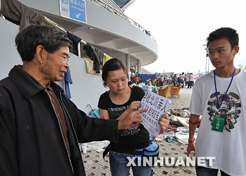 5月16日,志愿者張微(中)和同伴在四川綿陽九洲體育場幫助災民尋找家人。新華社記者 焦衛(wèi)平攝