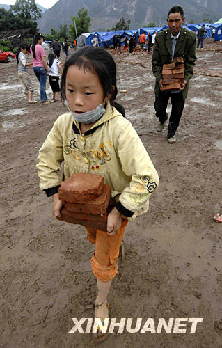 5月29日,孩子們和大人一起傳遞磚頭。因持續(xù)降雨,四川北川縣擂鼓鎮(zhèn)一個受災群眾安置點帳篷周圍泥濘不堪,安置點內的30多名孩子紛紛行動起來,與大人們一起使用倒塌房屋的磚塊修建簡易通道,方便人們通行。新華社記者岳月偉攝