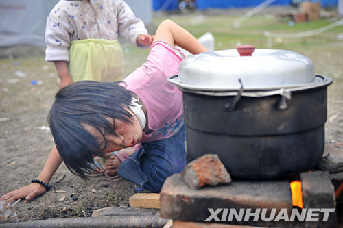 5月24日,10歲的王永霞在北川縣地震災區(qū)臨時安置點內生火做飯。王永霞的學校在地震中被毀了,無法繼續(xù)上課,住在臨時安置點的她就幫著大人干點力所能及的活,成了父母的好幫手。新華社記者 郝同前攝
