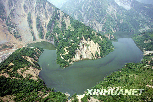 從空中俯瞰唐家山堰塞湖全貌(5月28日攝)。[新華社圖片]