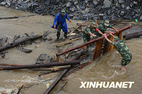 為加快泄流,7日6時(shí)20分,在微明的天空下,武警水電部隊(duì)的官兵不顧連續(xù)奮戰(zhàn)的疲勞,在唐家山堰塞湖大壩泄流槽左側(cè)的山坡上又投入新一天的戰(zhàn)斗:他們動(dòng)用機(jī)械對(duì)泄流槽加寬加深,增加泄流能力。