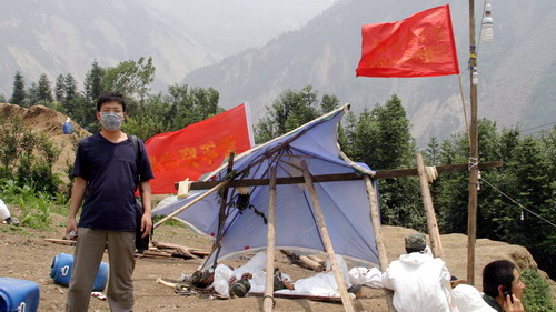 真正讓他體驗到天崩地裂感覺的還是5月23日那次余震。在到達(dá)災(zāi)區(qū)的第三天,他和同事李亮去采訪都江堰市虹口鄉(xiāng)黨委這個典型,大約上午10點多,途經(jīng)塌方后臨時開掘的路段,那是一條由碗口大的石頭堆成的路,底盤低的車子根本過不去,一行人只有換了個底盤高的松花江小面包車。由于路窄只能通過一輛車,還要隨時躲避山上滾下來的石頭,不少車被石頭砸扁。短短的一段路,他們竟走了一個多小時,才終于在中午到達(dá)了虹口鄉(xiāng)黨委所在地。