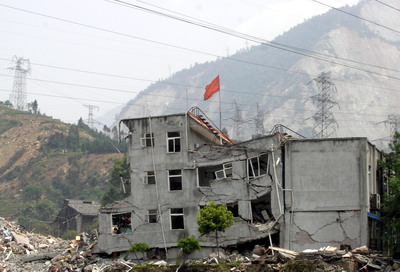 圖片說明:在映秀鎮(zhèn),像這樣的樓房僅存兩三座,隨時都有倒塌的可能(蘇民攝)