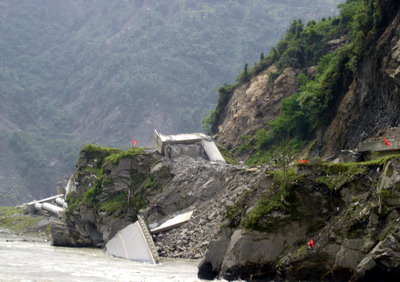 圖片:地震使都江堰市通往汶川縣映秀鎮(zhèn)的公路徹底毀壞。(蘇民攝)
