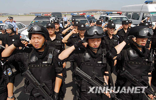 7月3日,北京首都國(guó)際機(jī)場(chǎng)公安分局在首都機(jī)場(chǎng)新專機(jī)樓舉行奧運(yùn)安保誓師大會(huì),參加首都機(jī)場(chǎng)安全保衛(wèi)工作的公安民警、輔警共300人莊嚴(yán)宣誓,表達(dá)誓保奧運(yùn)平安的信心和決心。新華社記者王建華攝