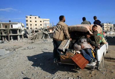 1月12日,在加沙地帶南部的拉法,幾名巴勒斯坦人帶著從廢墟中找到的物品乘車(chē)離開(kāi)。