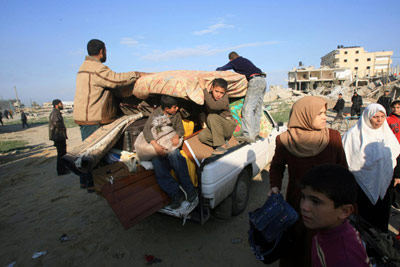 1月12日,在加沙地帶南部的拉法,幾名巴勒斯坦人帶著從廢墟中找到的物品乘車(chē)離開(kāi)。以軍對(duì)加沙的軍事行動(dòng)造成大批巴勒斯坦人流離失所,淪為難民。