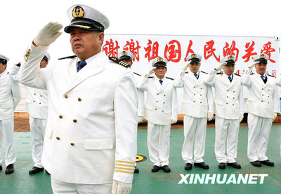 1月23日,“振華4輪”船長彭維源(前)帶領(lǐng)船員向歡迎人群敬禮致意。
